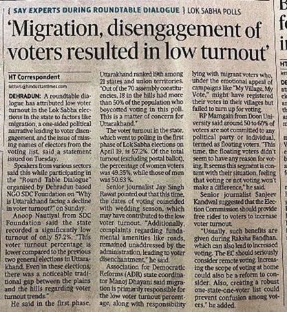 SDC Foundation organised a seminar on "Post-Election Analysis on the Decline in the Vote Percentage" at Hotel Inderlok, Dehradun on 28th April 2024. The ADR Uttarakhand participated in the session with the leaders of the civil societies. In this brainstorming session, the ADR Uttarakhand deliberated on why there was apathy for the elections among the voters in the 2024 General Elections and why there was low turnout.