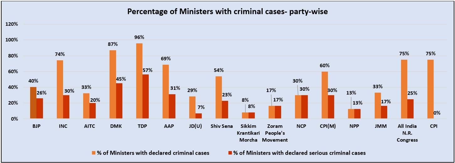 As many as 88(26%) of 336 ministers are from BJP; 18(30%) of 61 ministers from INC; eight (20%) of 40 ministers from Trinamool Congress; 14(45%) out of 31 ministers from DMK; 13(57%) of 23 ministers from TDP; five (31%) of 16 ministers from AAP, one (7%) of 14 ministers from JD(U) and three (23%) of 13 ministers from Shiv Sena.