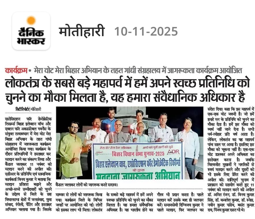 At the Gandhi Museum, Motihari, East Champaran, the Bihar Election Watch, in collaboration with Action for Accountable Governance, Netrika Foundation (Motihari), IDEA, District Sarvodaya Mandal (East Champaran, Bihar), organised a voter awareness campaign for women on 08th November 2025. During the event, participants took a pledge to vote by signing a campaign board and lighting candles to appeal for voting on the polling date.